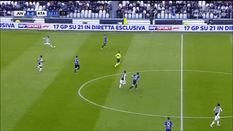Al minuto 38 la Juventus crea un’altra occasione significativa con Higuaìn che riceve palla vicino alla linea di centrocampo e ha lo spazio per avanzare di parecchi metri e servire il taglio di Dybala (fischiato poi il fuorigioco). Anche quest’azione però è esemplificativa del fatto che la Juventus sappia interpretare sempre meglio queste transizioni complici un rendimento eccellente dei tre sudamericani e un’ Atalanta molto sbilanciata.