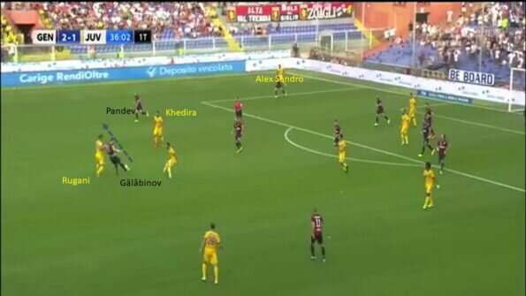 Rugani tenta l’anticipo su Gălăbinov, che però è più lesto e con un passaggio di prima apre benissimo il campo per Pandev. Le spaziature tra compagni e reparti sono sballate: Alex Sandro è lontanissimo, perché la Juve aveva attaccato posizionalmente per un buon minuto, Khedira non se ne avvede, e Chiellini (fuori inquadratura sulla sinistra), scappa all’indietro. Il Genoa arriverà in porta, e solo una provvidenziale diagonale di Lichtsteiner eviterà il gol.