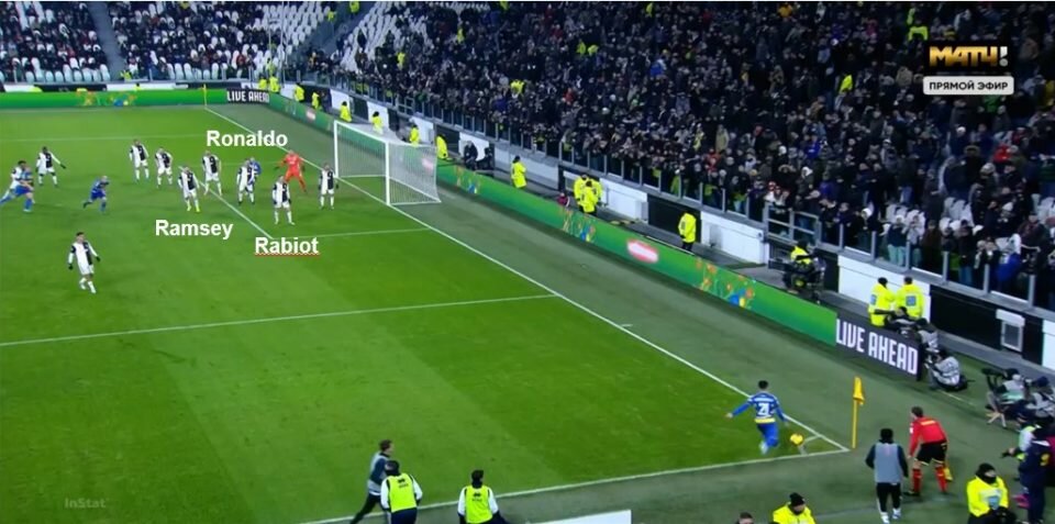 Se qualcosa può essere detto del posizionamento generale della squadra bianconera in questa situazione, riguarda semmai la distanza fra Ronaldo e Rabiot, forse troppo grande. In questo senso si poteva cercare di accorciare la linea difensiva verso il francese, in modo da ridurre la zona di competenza del portoghese.