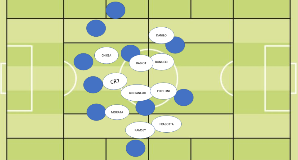 Partiamo dal 3-2-5 o 3-1-4-2 con il quale la Juventus si schiera col pallone tra i piedi. Le soluzioni possibili sono molteplici coinvolgendo almeno due giocatori che si scambiano la posizione ricoperta. Alcune: Ronaldo che dal centro si allarga a sinistra con esterno che taglia dentro il campo e mezzala che attacca spazio lasciato libero da Ronaldo. Partendo dalla formazione di rombi, che come ricorda Viscidi sono essenziali per dare molteplici linee di passaggio e fare densità in caso di perdita del possesso per riaggredire immediatamente. Questo lo abbiamo visto fare in poche partite (Parma per esempio): non possiamo chiedere questo a Rabiot e Bentancur in difficoltà negli spazi stretti, ma a diversi giocatori presenti in rosa sì (quelli citati sopra, per esempio).